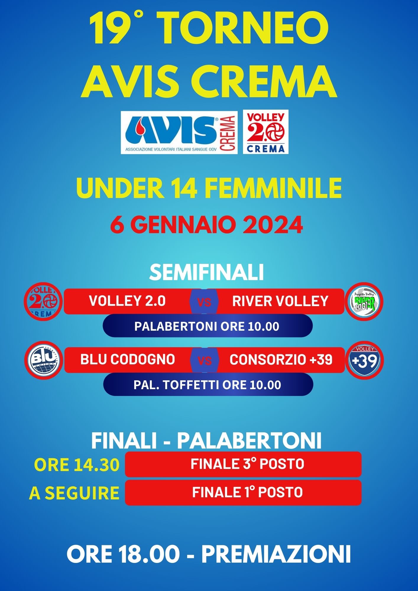 Con l’Epifania arriva il tradizionale appuntamento col Torneo AVIS Crema di volley, giunto alla 19ª edizione. In questa edizione la manifestazione sarà riservata alle squadre Under 14 femminili e si giocherà tra mattina e pomeriggio di sabato 6 gennaio.