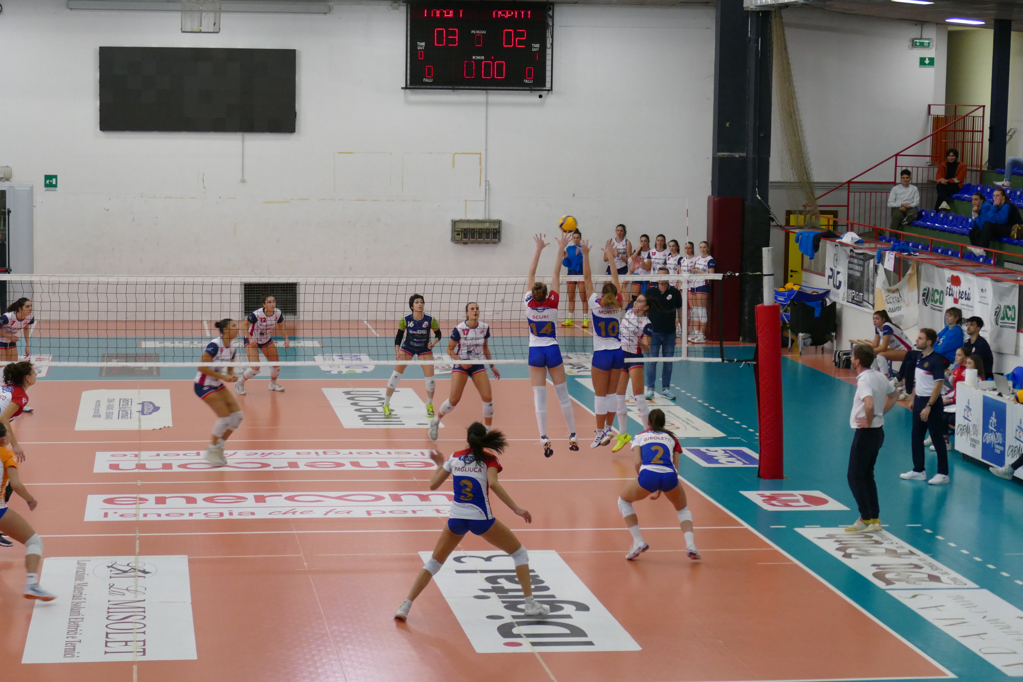 Nel secondo set i primi due punti sono per emiliane ma l’Enercom Fimi risponde con quattro punti consecutivi e le due squadre lottano punto su punto, con lunghi scambi, fino al 10-9 di Bianco. Poi le cremasche faticano a reagire al primo errore e concedono sei punti consecutivi alle ospiti per il 10-15. Moschetti prova a cambiare l’inerzia dell’incontro con i cambi e la squadra tiene il passo delle avversarie fino al 16-19 poi cinque punti consecutivi delle emiliane chiudono di fatto il set.