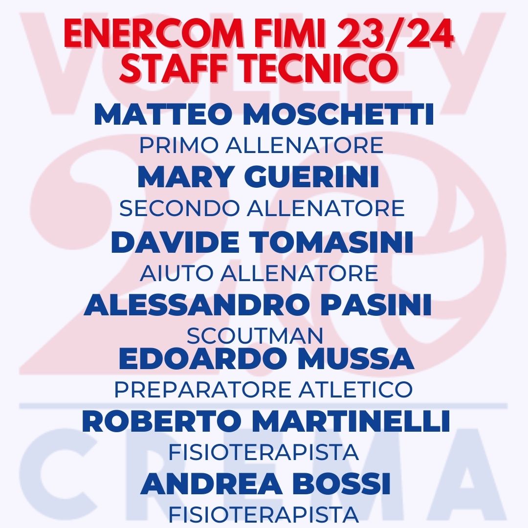Staff vincente non si cambia. Coach Matteo Moschetti potrà contare, nella gestione dell’Enercom Fimi, sullo stesso gruppo di collaboratori della passata stagione chiusa con un positivo quarto posto in B1 che ha confermato il trend di crescita del gruppo che dura da anni. La prima riconferma è stata quella del secondo allenatore Mary Guerini, nella prima squadra per la settima stagione e punto di riferimento per il gruppo. Il supporto tecnico al tecnico sarà assicurato anche da Davide Tomasini, forte dell’esperienza maturata in diversi staff tecnici, anche di A1. Il ruolo di scout, per il secondo anno, sarà affidato ad Alessandro Pasini, che nel Volley 2.0 ricopre anche il ruolo di allenatore delle giovanili.