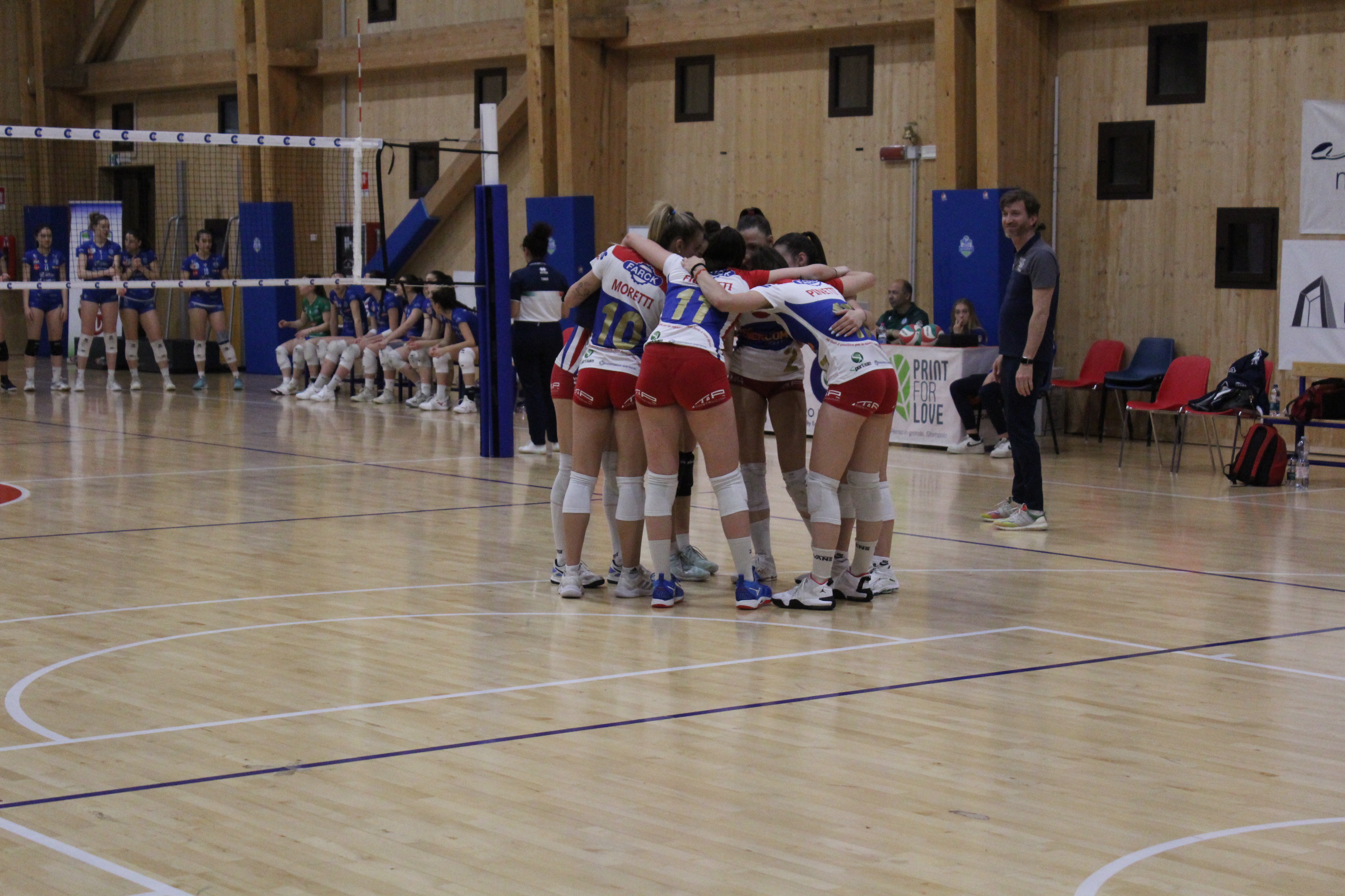 Coach Moschetti, un po’ per scelta e un po’ per problemi fisici, cambia il sestetto di partenza rispetto alle precedenti gare: Moretti è la palleggiatrice con Giroletti opposto, Pinetti e Bocchino le schiacciatrici, Fioretti e Ravazzolo le centrali con Guerini Rocco libero.