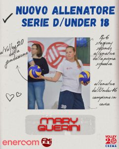 Mary Guerini sarà l’allenatore dell’Under 18 del Volley 2.0 che parteciperà anche al campionato di serie D. Tecnico del sodalizio biancorosso sin dalla formazione, nelle ultime sei stagioni Guerini è stata il secondo allenatore della prima squadra cremasca prima in B2 e poi in B1 oltre che allenatrice di diverse squadre giovanili, da ultima l’Under 16 che ha conquistato il titolo territoriale 2024/25.