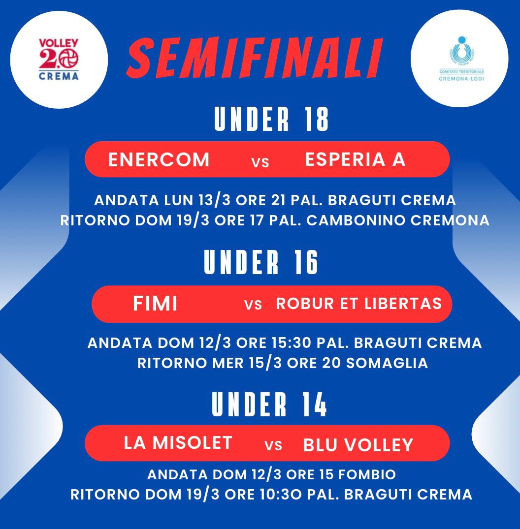 In Under 16 la Fimi, prima nel girone A, affronterà la Robur et Libertas Cryo Service che ha chiuso la stagione reolare al primo posto nel girone B. Le cremasche hanno subito una sconfitta mentre le lodigiane (disputano le gare casalinghe a Somaglia) hanno vinto tutte le gare della prima fase ed hanno così acquisto il diritto di giocare in casa sfida di ritorno ed eventuale bella. Gara d’andata in programma domenica 12 marzo alle 15.30 nella palestra Braguti di Crema. Ritorno a Somaglia mercoledì 15 marzo alle ore 20. L’altra semifinale si gioca tra NVP Vizzolo e Piadena Blu.